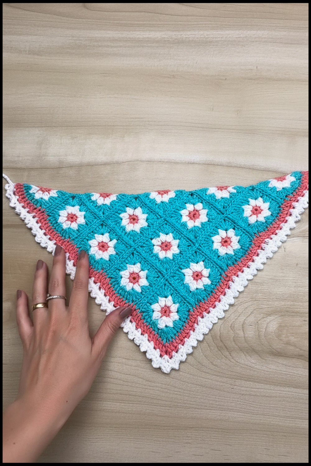 Tie on charm with this free crochet square floral bandana pattern that feels light, pretty and suits daily wear outdoor trips and warm days.