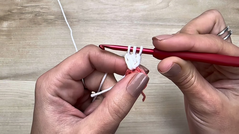 - Pass needle under both loops of stitch 2 (“head”), from back to front.