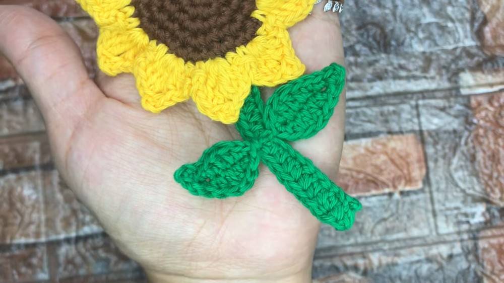 - Yarn: 2 mm thick yarn in three colors: brown (center), yellow (petals), green (stem and leaves)