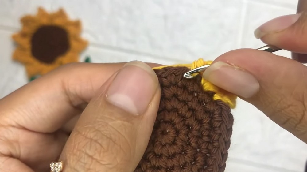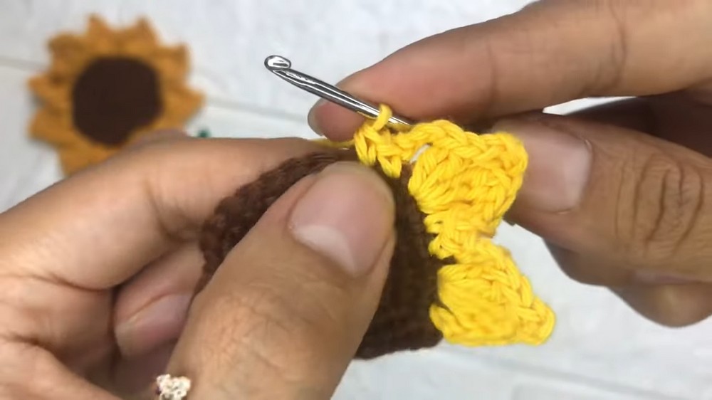 - Sk next st, sc in next. (Petals anchor to flower in every other stitch, so that they’re well-spaced. Adjust as needed to fit around the circle evenly.)