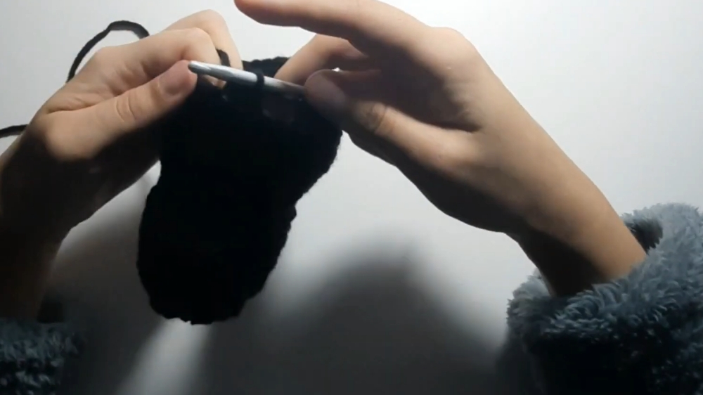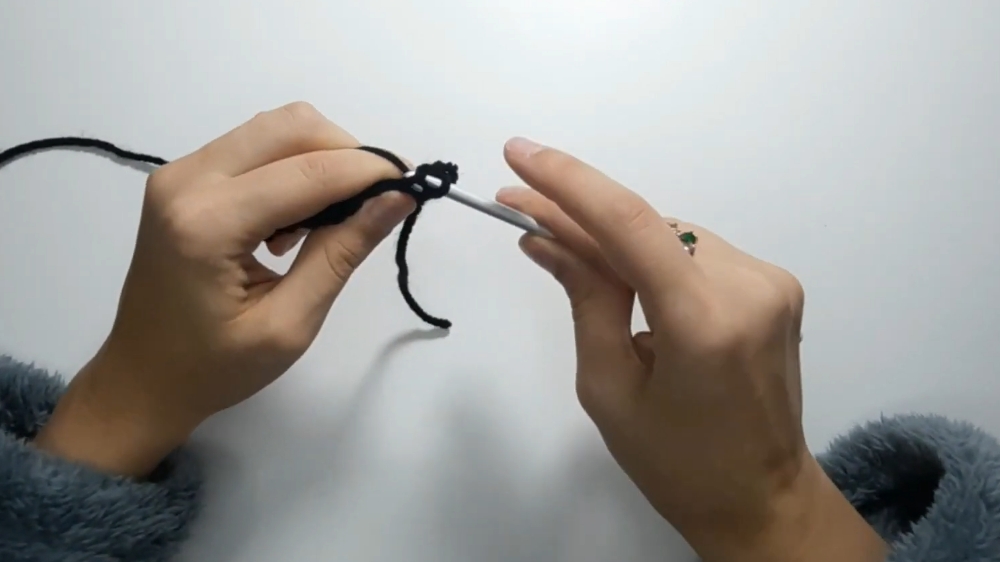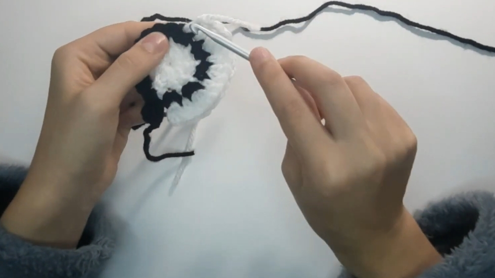 - Insert your hook into the last slip stitch from the white yarn section and attach the black yarn by chaining one.