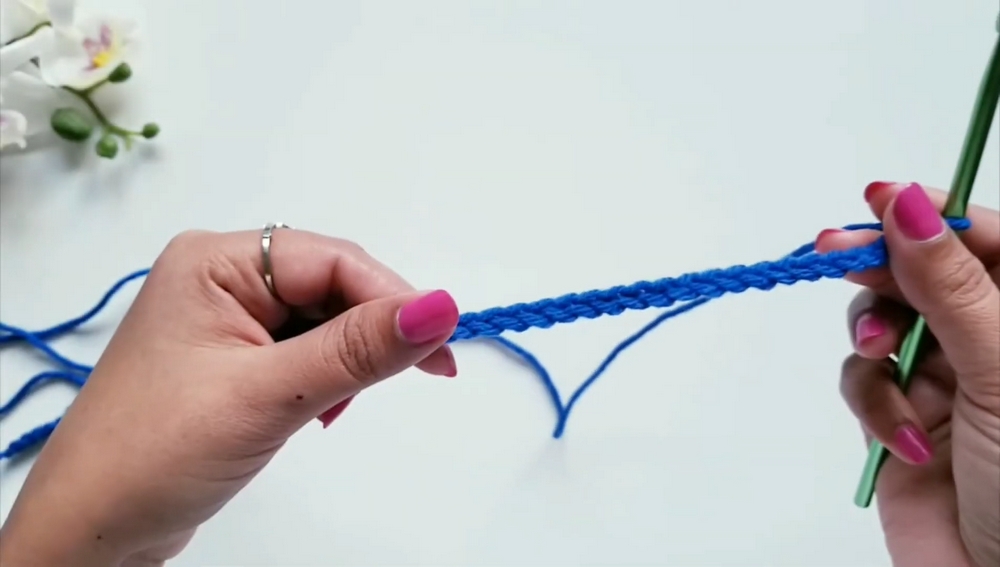- After completing your base chain, crochet three additional chains. These chains will count as the first double crochet stitch in your row.