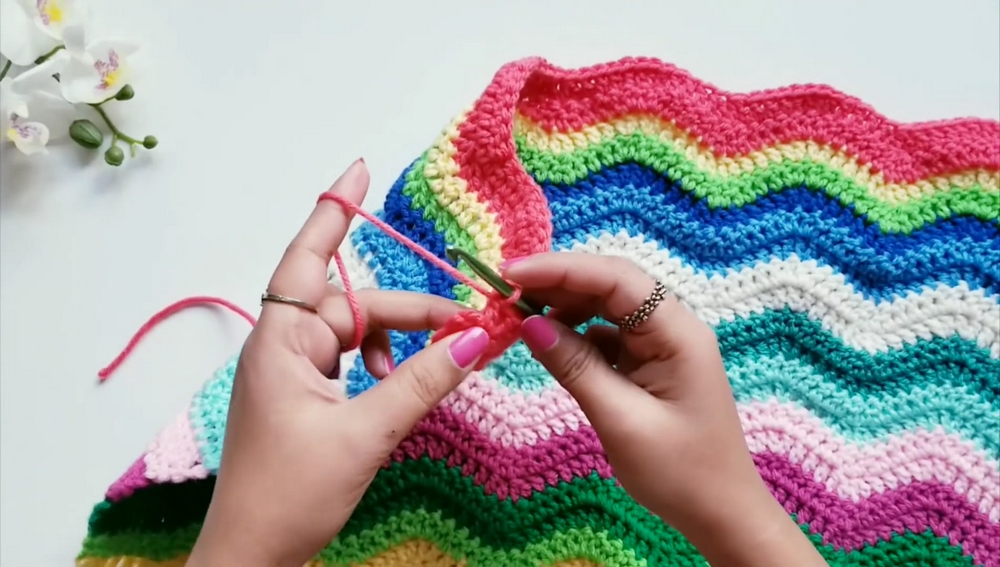 - To create a colorful ripple pattern, switch to a different yarn color at the end of the row.