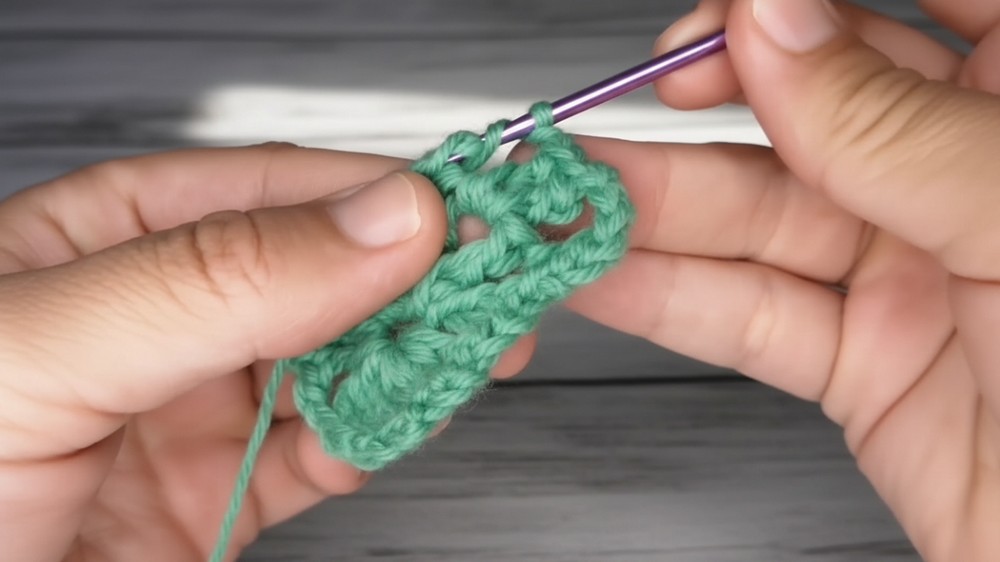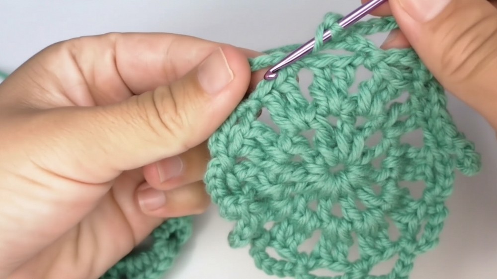 - Sl st into the next ch-2 space, ch 3 (counts as a dc). Work 1 dc into the same space.