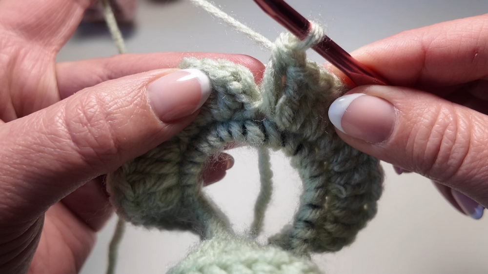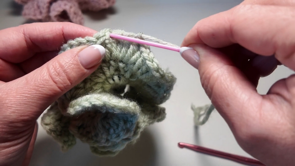 - In the last row, add even more ruffles by working three double crochets into each stitch using the same method as above.