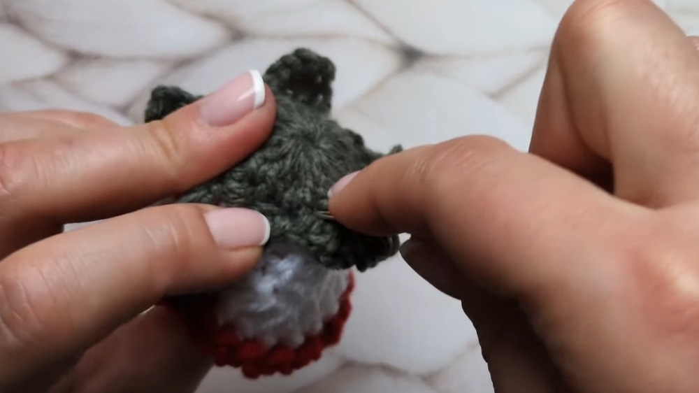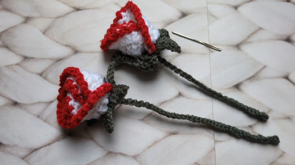Using crafting wire to secure the base and stitching the layers together with a needle ensures stability and durability. The wire also serves as the foundation for the stem, which is covered in green yarn through a series of closely worked single crochets.