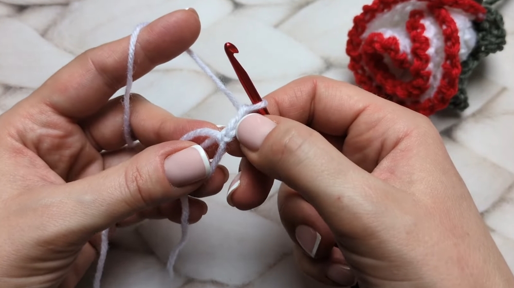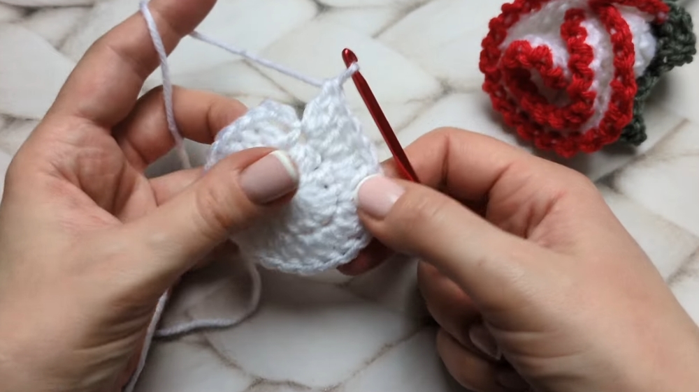 The incorporation of alternating stitches gives the rose a natural, multi-dimensional appearance that mimics the soft folds of real petals. To enhance the visual effect, a second yarn color is introduced to highlight the edges with subtle zigzag detailing, capturing the realism of a blooming rose with finesse.