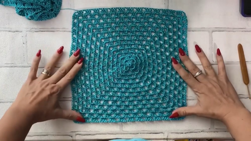 - Continue increasing in this pattern, always working corner: (3 dc, ch 2, 3 dc) in each corner, and filling sides with 3 dc clusters in each ch-1 space, until your square measures about 30 x 30 cm (or half your bust/back width).