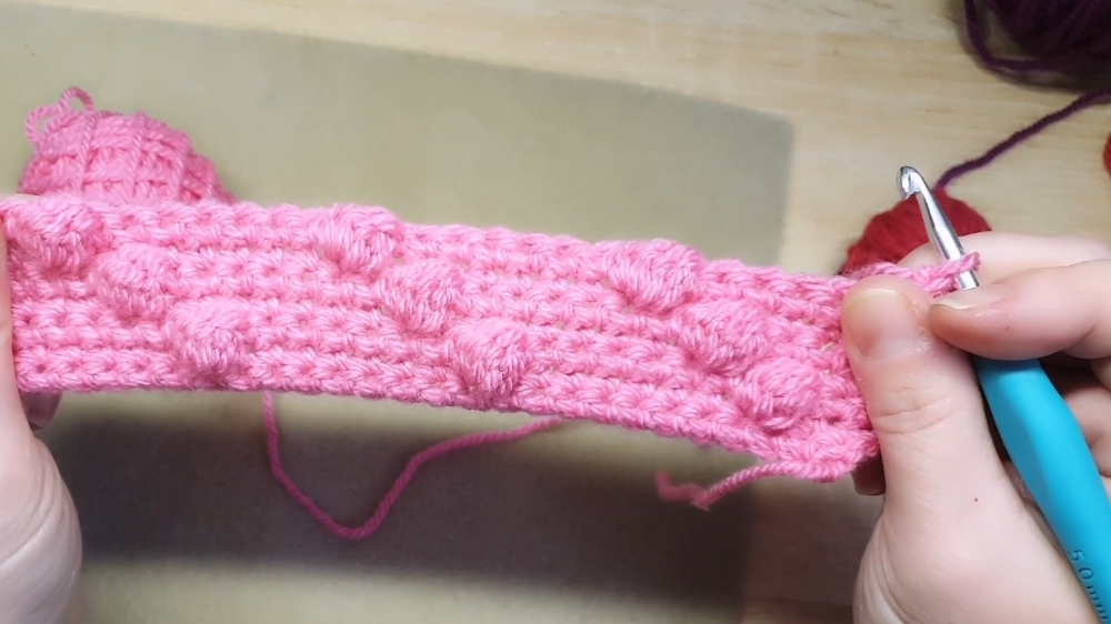 - Repeat the Pattern: Work additional sections with the same pattern of bobbles (7, 5, 3) surrounded by double crochet rows.