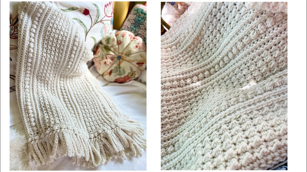 - The blanket features borders with berry stitches and optional fringe, adding decorative elegance to the design.