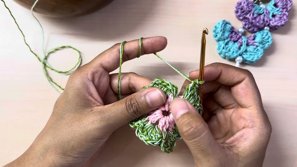 - Introduce Green Threads: Attach two strands of green thread in the space between the first chain three and double crochet of the base round.