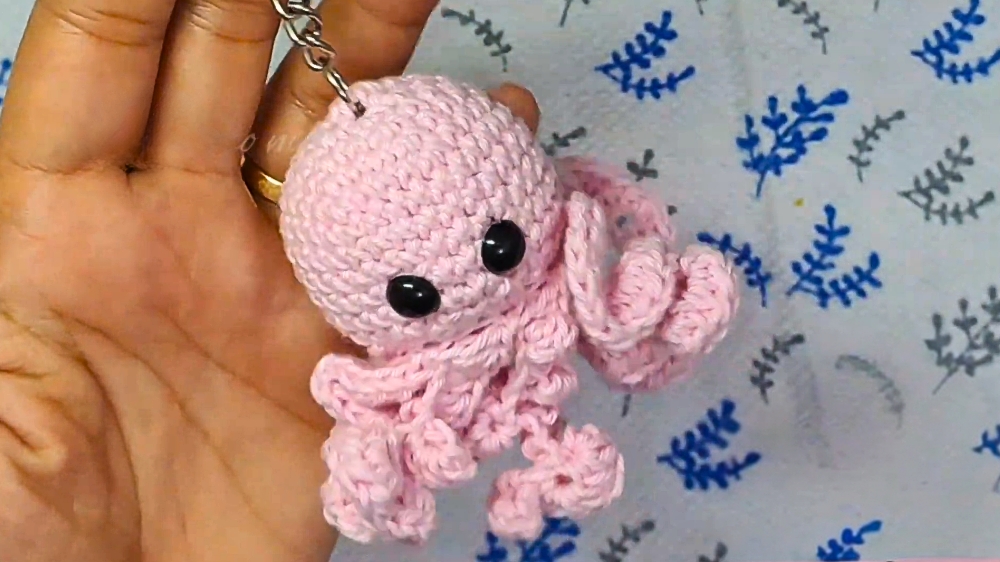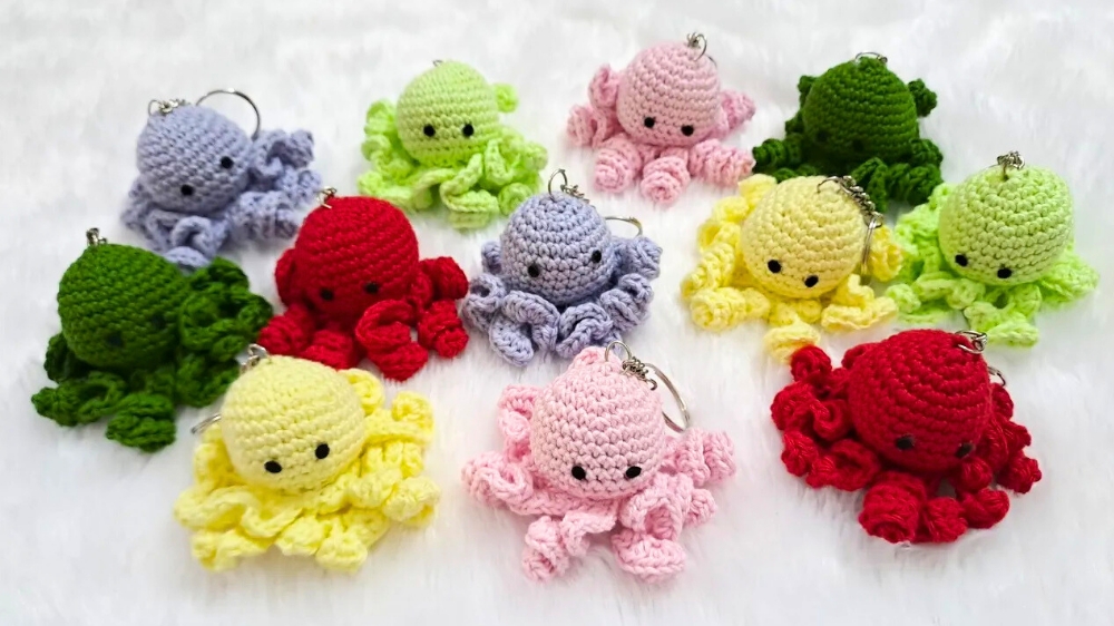 A total of eight tentacles are made and carefully stitched around the head’s base, ensuring an evenly spaced, aesthetically pleasing arrangement. Once the body is stuffed with soft fiber filling and securely stitched closed, the keychain is ready to shine.