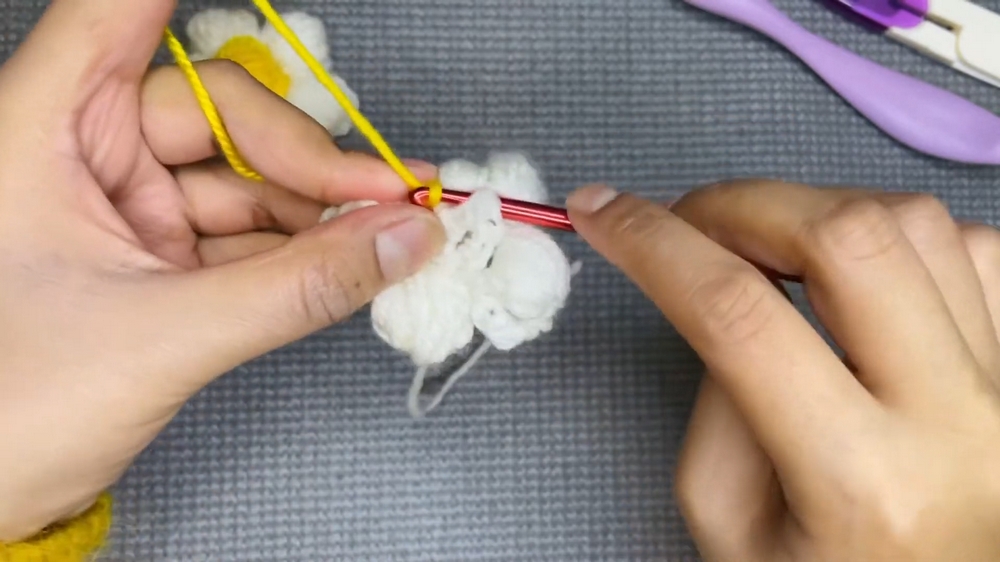 - Repeat for the desired petal count and pull the magic ring tight to close the center.