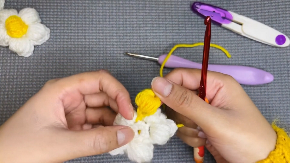 - Two colors: one for the petals (e.g., white) and one for the center (e.g., yellow). Thicker yarn is preferred for better results, although thinner yarn works fine.