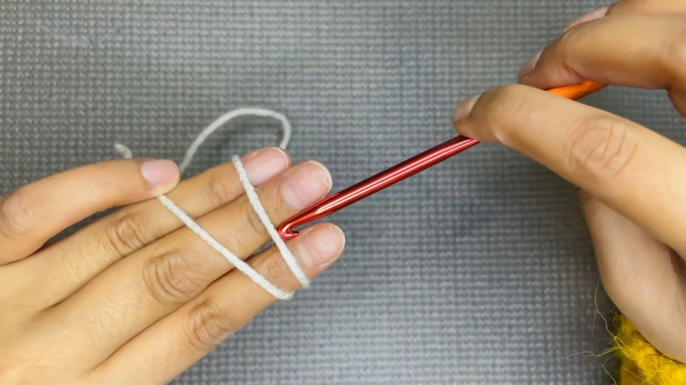 - Insert the hook under the first yarn, pull the second yarn through, and secure with a single crochet.