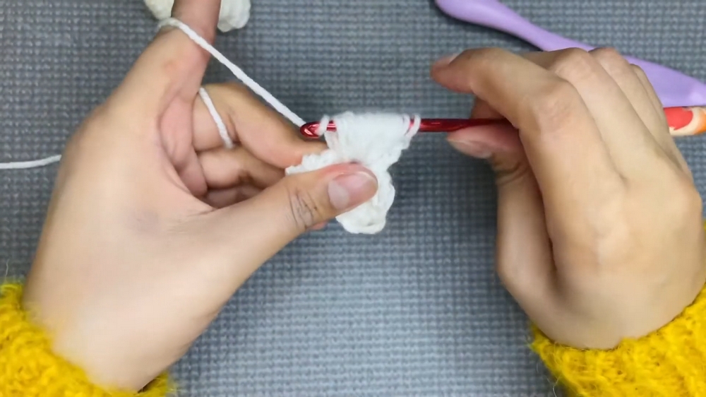 - Chain 4, and in the fourth chain, create a puff stitch following the same method as the petals (yarn over, pull loops through 9–10 times).