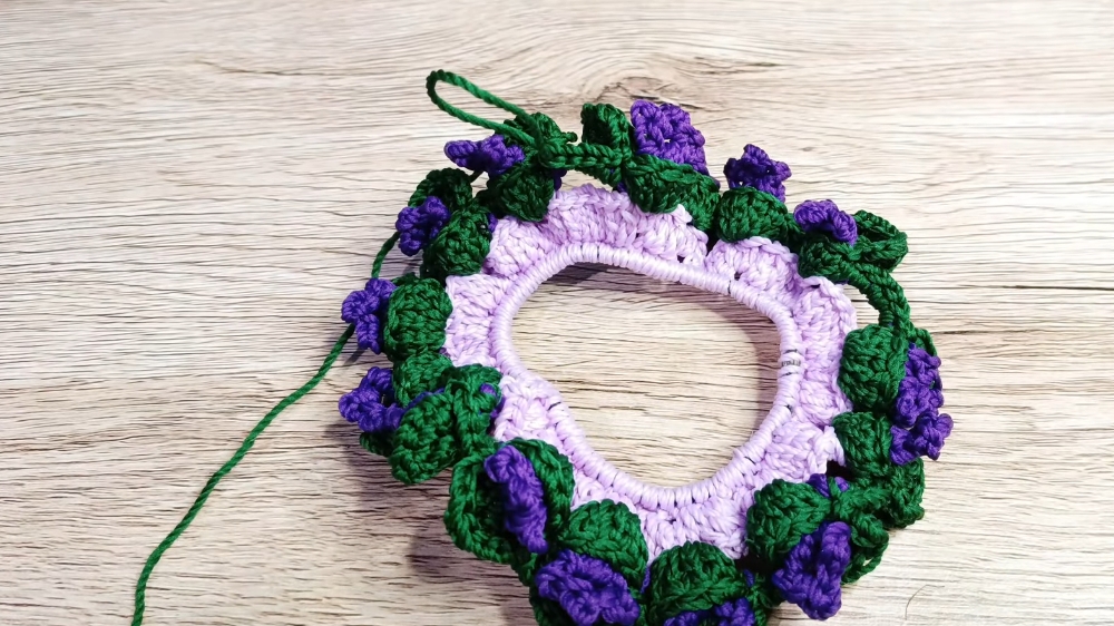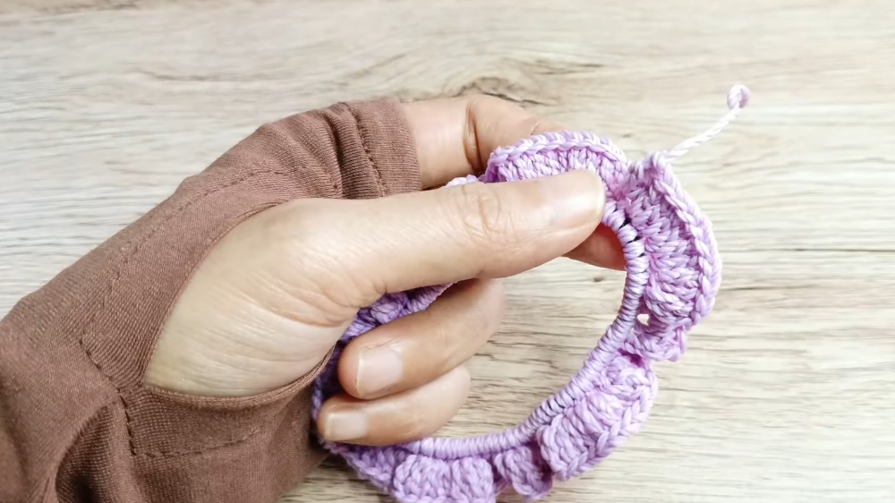 This pattern results in a functional yet decorative accessory that serves as both a hair tie and a wrist adornment. It is vital to ensure all yarn tails are securely woven into the back of the work to prevent unraveling during use.