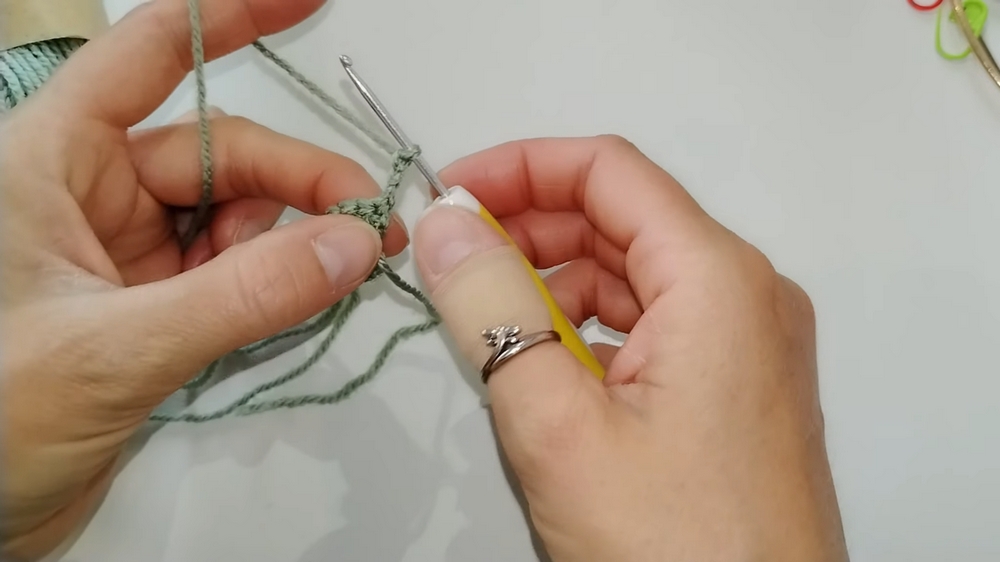 - Yarn over, pull through all loops, chain 1 to close and chain 1 for space.