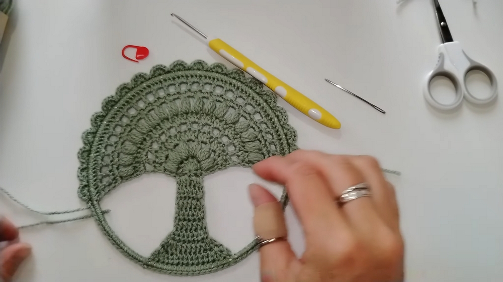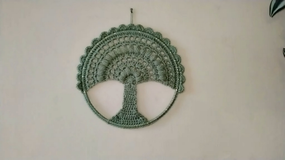 - The crochet pattern forms a tree with intricate branches and leaves, symbolizing growth and life.