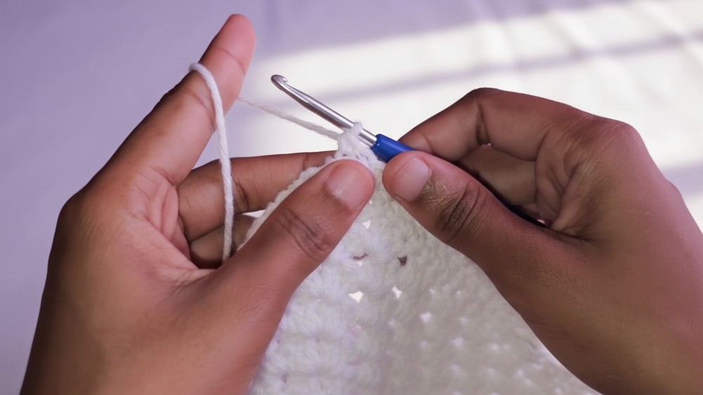 - Join yarn with a slip knot into the chain 1 space of the first square’s corner.