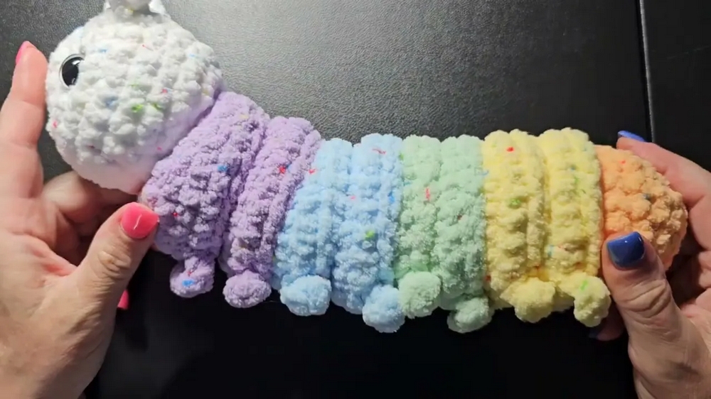 The fidget-friendly caterpillar by "Whip and Chain" is an enjoyable project for both beginner and intermediate crocheters. Its playful design, glittery details, and functional twist appeal to all ages, making it a wonderful handmade gift or personal project. Follow the pattern, have fun with your color choices, and enjoy crocheting your very own friendly caterpillar.