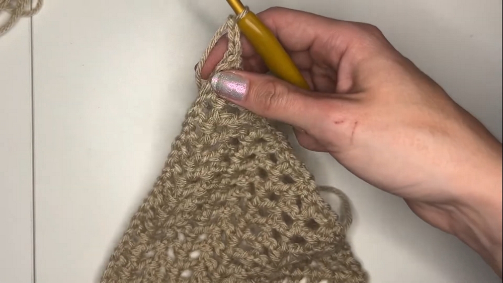 - Chain 2 at the tip of the bandana before starting the next side.