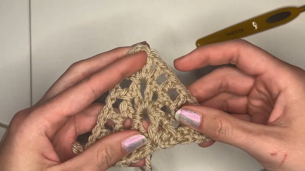 - Chain 1, double crochet, chain 1, double crochet again into the chain space.