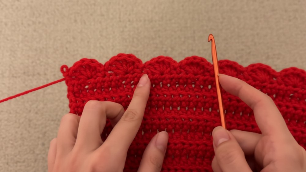 - Skip 1–2 stitches (depending on spacing) and work another 5 DC scallop into the 3rd stitch.