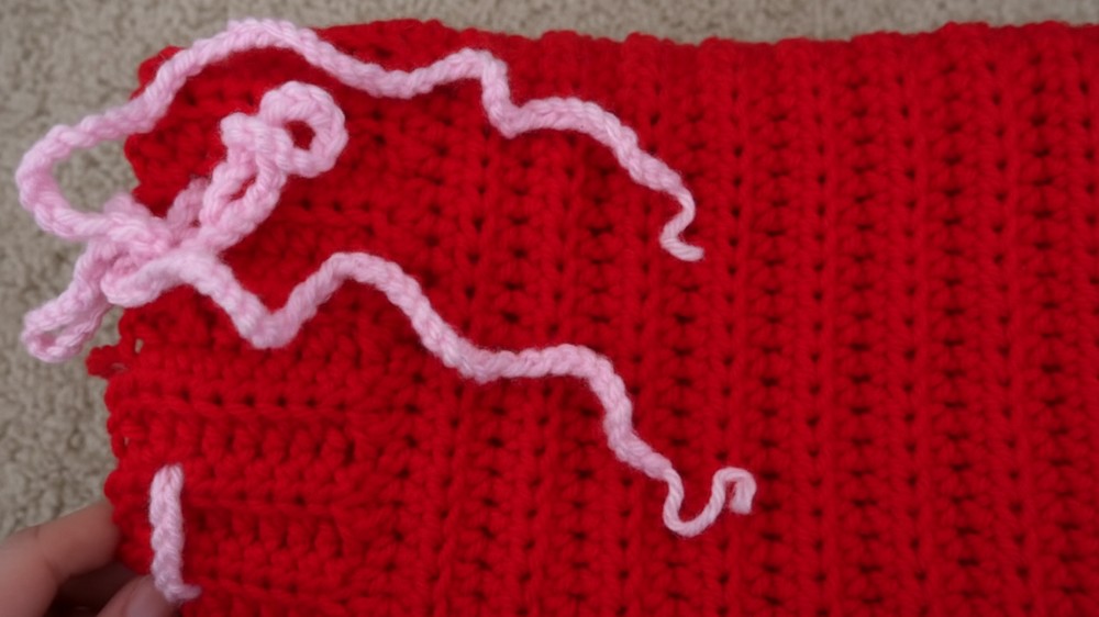 - Create a long CH in the contrasting yarn color for threading through the holes in the cuff.
