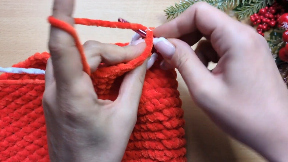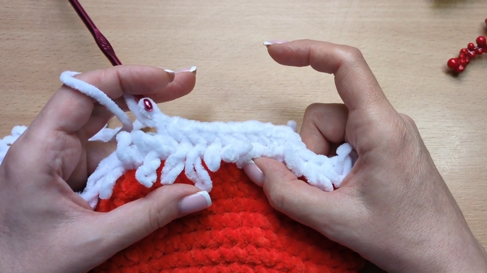 Starting with the brim, you work in rounds with double crochet stitches, adding a few rows of white yarn to achieve the fluffy appearance.