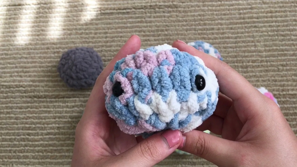 Midway into the creation of the blob, personality comes into play when safety eyes are added. These small, shiny eyes are inserted securely, making each blob uniquely charming.