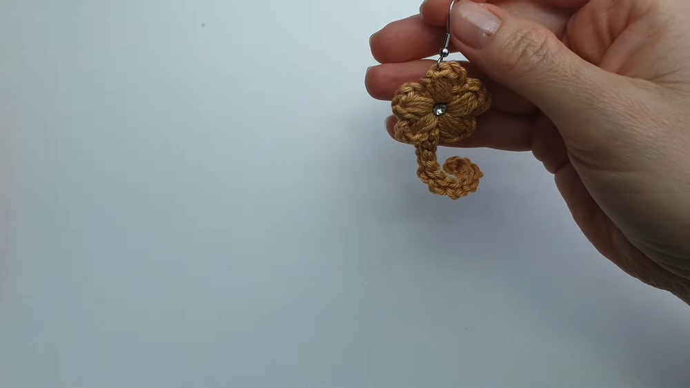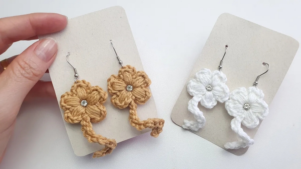 Once the flower is complete, a decorative touch can be added rhinestones, pearls, or beads serve as the perfect centerpiece. To finish, a sturdy backing is crocheted and attached seamlessly to the flower, completing the earring with elegance.