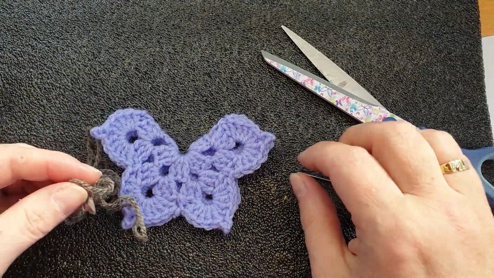 Using a darning needle, sew the butterfly body tightly to hold its wings in place. Antennae are formed by leaving short yarn tails at the top of the body, trimmed to a suitable length.