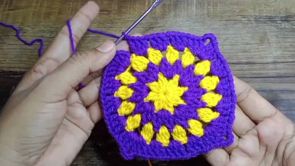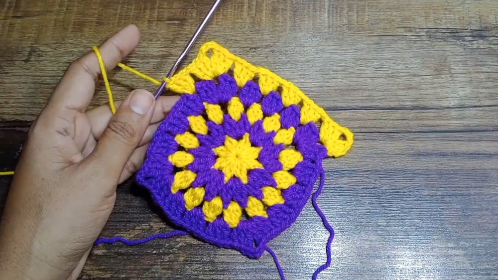 - In each gap, make three double crochets (DC), three chains, and again three DCs to form the corners.
